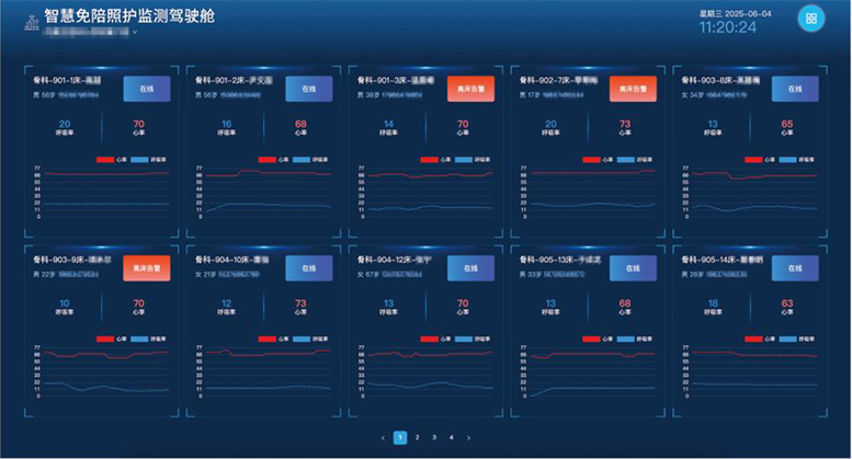 一键巡视患者生命体征情况(包含呼吸率、心率、在床/离床等尤其深夜,减轻护士巡房压力及患者受干扰次数,提升护理效率