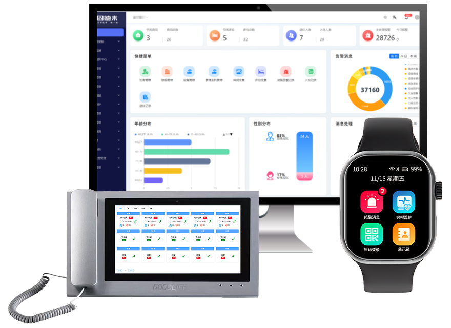 免陪照护管理平台:适用医院内免陪陪护场景、机构非陪护式护理场景,为医院、护理机构提供的专业化管理工具。 实现免陪照护全流程的实时监管、风险预警与精细化管控,在保障照护安全的同时,提升服务效率、服务质量及患者/家属满意度。 平台支持多端数据高效协同,包括运营管理电脑端、电子白屏端、护工手表端、护士站接警主机端,部分场景可拓展家属查看端,确保各角色实时获取照护动态,协同推进服务落地。